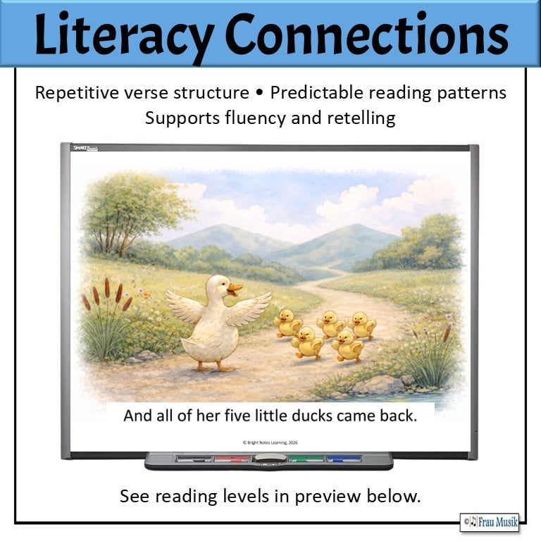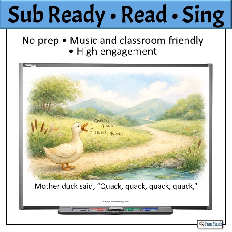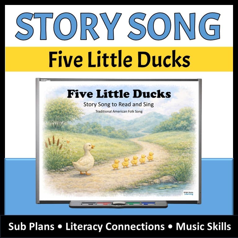 Bring music, reading, and subtraction together with this illustrated Five Little Ducks story song set for elementary music and K–1 classrooms. This resource combines elementary music activities, literacy support, and simple math connections in a way that’s easy to use.